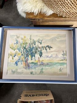 Vintage Artwork Watercolor Calming Tree Landscape Teal Green Lavender $95Los Angeles, CA