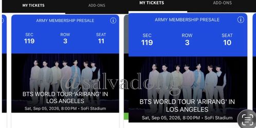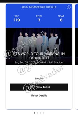 BTS Concert ARIRANG DAY3 • Section 119, Row 3, Seats 8–11$1,500Garden Grove, CA
