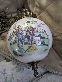 Beautiful Vintage Asian Geisha GIRLS IN GARDEN HAND PAINTED HANGING GLASS GLOBE BRASS BASE SWAG LAMP ORIENTAL GARDEN SCENIC LIGHTING - SIMPLY STUNNING$200Philadelphia, PA