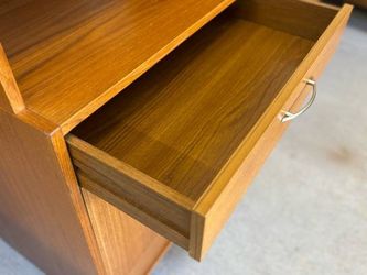 anish teak two-piece china cabinet with lighted glass hutch at top and buffet base below. Vintage 1980s with a nice orange hue to the aged teak wood. $300Lakewood, WA
