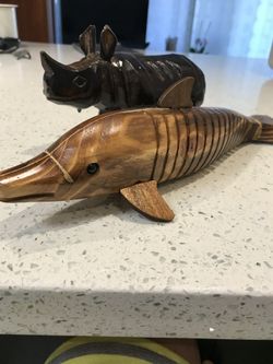 Gorgeous Hand Carved And Hand Painted Wooden Animal Figurines. Fish is 12.5 inch L and 3.5 inch H and a Rhinoceros L -8 inch and H- 4.5 inch. $20Sunny Isles Beach, FL