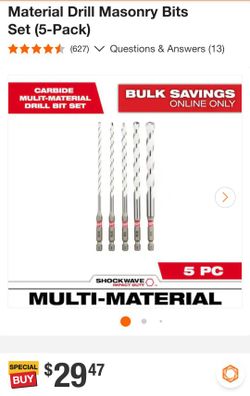 Milwaukee SHOCKWAVE Carbide Multi-Material Drill Masonry Bits Set (5-Pack)$20Santa Clara, CA