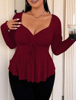 Flirla Plus Size Women Diamond V-Neck Front Drawstring Rib Knit Long Sleeve T-Shirt, For Thanksgiving$10Lemon Grove, CA