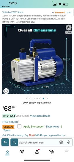 ZENY 3,5CFM Single-Stage 5 Pa Rotary Vane Economy Vacuum Pump 3 CFM 1/4HP Air Conditioner Refrigerant HVAC Air Tool R410a 1/4" Flare Inlet Port, Blue$35Artesia, CA