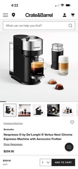 New Bestseller Nespresso ® by De'Longhi ® Vertuo Next Chrome Espresso Machine with Aeroccino Frother$140San Francisco, CA