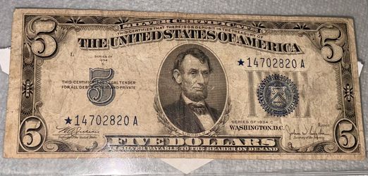 1934 C Five Dollar Silver Certificate, Blue Seal Star Note$70Phoenix, AZ