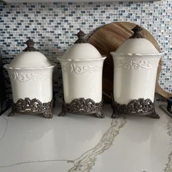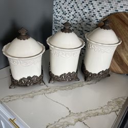 Utility Ceramic Kitchen Canisters Set of 3 with metal base, Cream/Ivory ceramic Chris Madden JC Penny Tuscan Corvella Stoneware Canister Set. T$175Henderson, NV