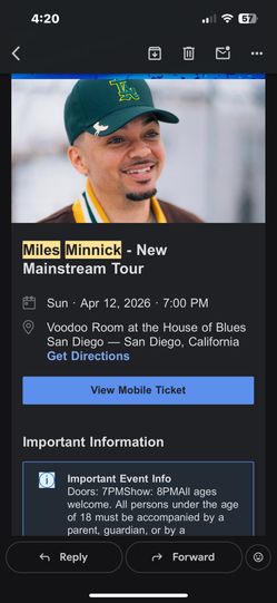 Miles Minnick - Concert - 2 Tickets - GA - Sunday April 12th - 7PM $70San Diego, CA