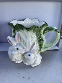Two White Bunnies Nestled By A Cabbage/ Lettuce Ceramic Spring Easter Pitcher $17City Of Industry, CA