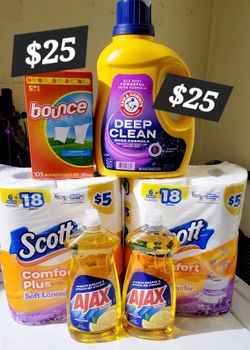 Arm & Hammer Deep Clean 68 loads/102fl oz, Bounce 105 Count, 2 Scott Comfort Plus 6=18 Rolls, & 2 Ajax (28 oz Bottles) For $25$25Bell Gardens, CA