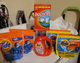 BUNDLE: 2 TIDE PODS BAGS (16 COUNT), TIDE DOWNY 21 LDS/30oz, Bounce Sheets (105 Count), & 2 TIDE SIMPLY BAGS (13 Count) For $28$28Bell Gardens, CA