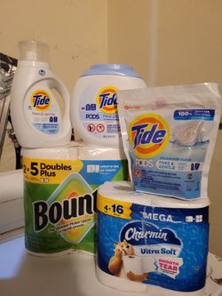 TIDE FREE & GENTLE 25 LOADS/34oz & Tide Pod Bag (16 COUNT), Bounty 2=5 Double Plus, TIDE POD TUB (42 COUNT), & CHARMIN Ultra Soft 4 MEGA = 16 For $32$32Bell Gardens, CA