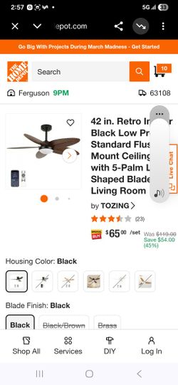 42 in. Retro Indoor Brown Low Profile Standard Flush Mount Ceiling Fan with 5-Palm Leaf Shap$33St. Louis, MO