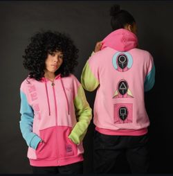 New size medium Cakeworthy Netflix's Squid Game color block hoodie featuring the guard symbols! $60Chula Vista, CA