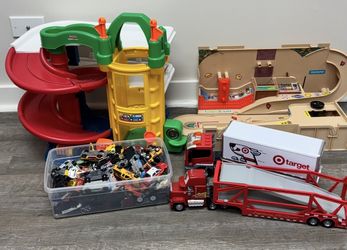 Toys-Bin of Small Cars, Garage, 2 Car Transporters, $20Northbrook, IL