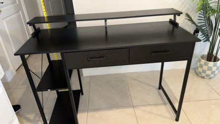 Black computer desk with a hutch, two drawers, and side storage shelves$60Davenport, FL