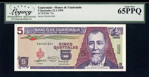 1992 5 Quetzals Banco de Guatemala Note Legacy Gem New 65 PPQ$28Cliffside Park, NJ