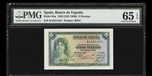 1935 Spain, Banco de Espana 5 Pesetas PMG Gem Unc 65EPQ$48Cliffside Park, NJ
