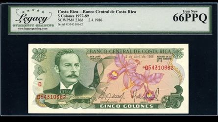 1986 5 Colones Banco Central de Costa Rica Note Legacy Gem New 66 PPQ$40Cliffside Park, NJ