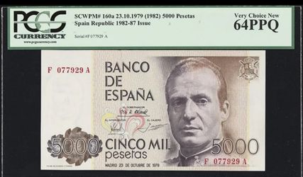 Sold1982 Spain, Banco de Espana 5000 Pesetas PCGS Very Choice New 64PPQ$58Cliffside Park, NJ
