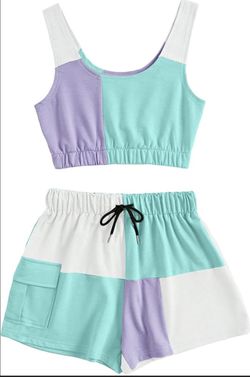 SHEIN PURPLE AND GREEN COLORBLOCK SLEEVELESS CROP AND PULL ON SHORTS SET B $16Odessa, TX