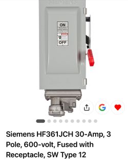 ($2000+tax) For $750 - Siemens HF361JCH 30 A 3-Pole 600 V Fused Safety Switch with Crouse-Hinds Receptacle – NEMA 12 Enclosure$750Elk Grove, CA