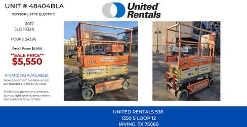 JLG 19’ Scissor Lift$5,550Irving, TX