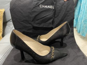 CHANEL BLACK ROUNDED LIZARD TOE METALLIC CC LOGO HEEL $285Alafaya, FL