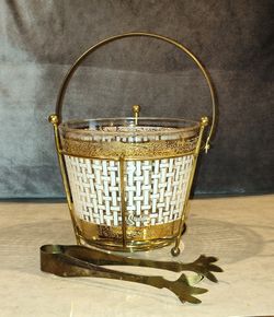 VINTAGE STARLYTE MID CENTURY MODERN GLASS ICE BUCKET WITH BRASS THONGS & CARRY BASKET GOLD FOIL & WHITE ETCHED PRISM PATTERN WITH BRASS CARRY BASKET $60Franklin Square, NY
