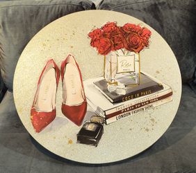 25" ROUND GLITTERY CANVAS FASHION & DESIGN PAINTING / WALL SIGN WITH RED HIGH HEELS, VASE OF ROSES, FASHION BOOKS & PERFUME BOTTLE.$28Franklin Square, NY