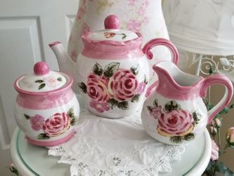 New "Amore" Shabby Chic Pink Rose Teapot~Creamer~Sugar Bowl Set $45Spring, TX