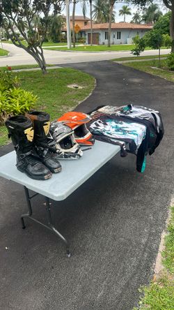 Off Road apparel Size 11 Boots, Two Large Helmets, Riding Pants And Shirt$40Deerfield Beach, FL