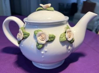 Teleflora Gift Ceramic Teapot in glossy White ceramic, Pink bisque 3D roses Victorian Style w periwinkle trim$21Fort Wayne, IN