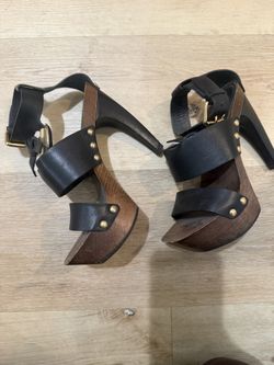 Louis Vuitton Size 35.5 Wood & Black Gold Sandals “V” emblem stiletto Heels Rare$250Fountain Valley, CA