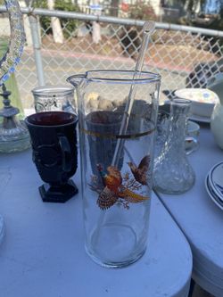 MCM Martini Cocktail Pitcher with pinched pour and gold Band. West Virginia Glass Co. Vintage Pheasants$25San Diego, CA
