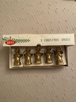 Vintage Shiny Brite Christmas Ornaments Set Of 5 Hard Plastic Gold Colored Angels With Original Box Made In Hong Kong $20Issaquah, WA