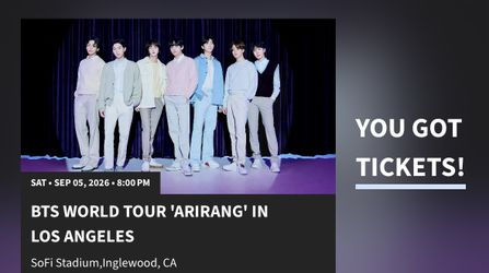 (4) BTS Tickets Los Angeles SoFi Stadium Saturday 9/5/26.$800San Francisco, CA