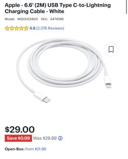 Apple 6.6’ (2M) USB Type C -to-Lightning Charging Cable - White$20Chino, CA