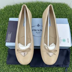 PRADA BALLERINA FLATS BEIGE LEATHER ENAMELED TRIANGLE LOGO BOW SZ 39/9 NEW CLASSIC$95Fort Lauderdale, FL