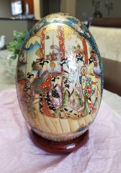 Vintage hand-painted Japanese Satsuma-style porcelain egg on a wooden stand. 8.5 In $24Conroe, TX