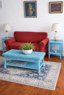Beautiful 3-piece turquoise wicker set with a perfect coastal beach vibe. Includes coffee table, end table, and matching stool. Very sturdy and well $140Lewes, DE