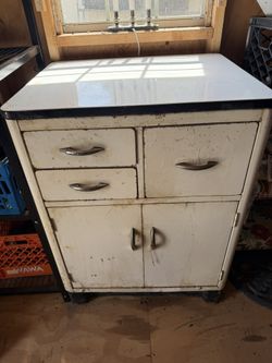 Vintage 1940s Metal Kitchen Cabinet with Porcelain Top Vintage 1940s metal kitchen cabinet with original porcelain enamel top. Solid and sturdy with$80Lewes, DE