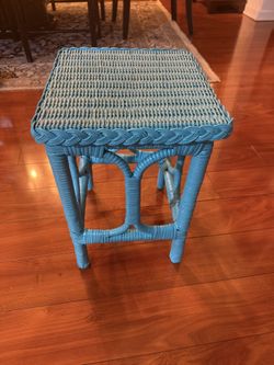 Beautiful turquoise wicker side table or stool in excellent condition. This piece has a great coastal beach vibe and would look perfect in a sunroom, $30Lewes, DE