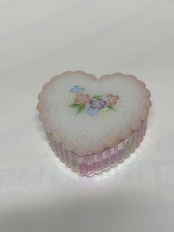 Fenton heart-shaped trinket box made of iridescent and white satin glass. It has a ribbed base and a hand-painted floral design on the lid. 1950’s Le$38Fontana, CA