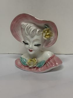 vintage 1950s Napco lady head vase, featuring a pink hat and dress with yellow rose accents. $40Fontana, CA