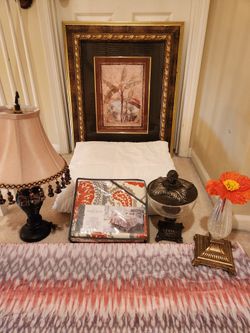 F/Q Blanket Bedding~Comforter+Duvet Cover+Pillow Shams (2)+Pillows (2)+Lamp (1) for a Nightstand/Night Stand/End Table/Desk+Frame Wall Art Work+Vase$50Overland Park, KS