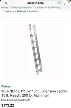 WERNER D1116-2 16 ft. Extension Ladder, 15 ft. Reach, 200 lb, Aluminum$100Arlington Heights, IL