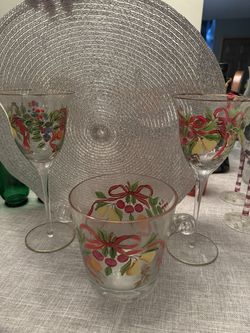 Hand painted Christmas themed glass ice bucket and 2 wine glasses$20Lemont, IL