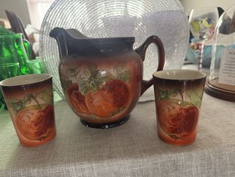 antique ceramic "Dutch Jug" and cups produced by the Taylor, Smith & Taylor Co. around 1915, featuring a hand-painted fruit motif.$30Lemont, IL