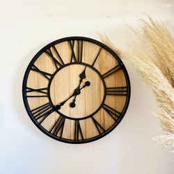 Tan Brown Natural Wood Black Iron Metal Oversized Wall Clock Circle Accent Decor$80Lemon Grove, CA